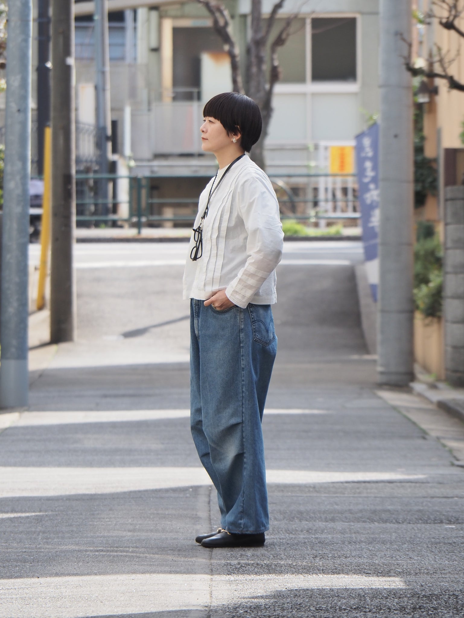 肩と身幅はゆったりと、着丈は短めなボックス型のシルエットで 首回り、前立て、袖口にレースを配して女性らしさを表現して さらに前後ボディにはタックを配して立体感を加えています
